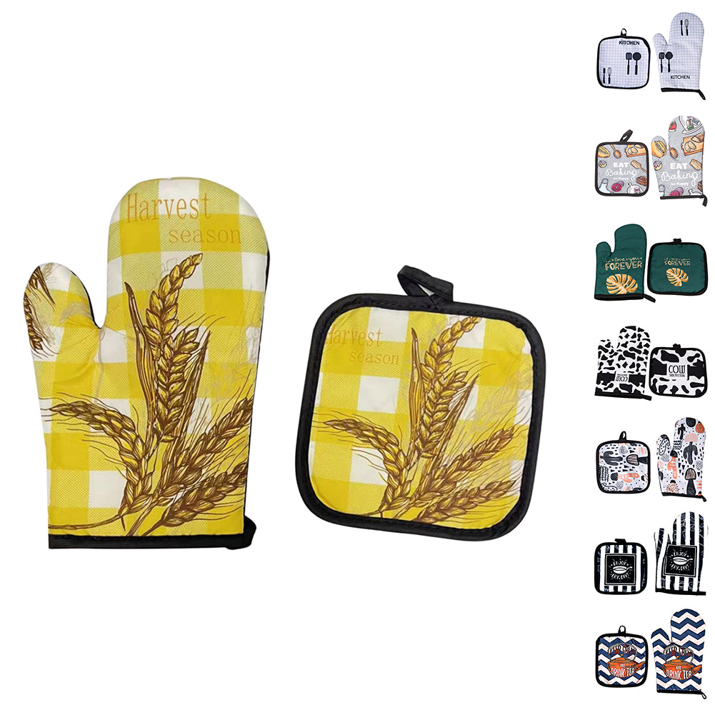 2Pcs Oven Mitts Pot Holders Sets Cute Print Heat Resistant Kitchen Mittens Cooking Gloves For Microwave BBQ Baking Grilling Yellow wheat style