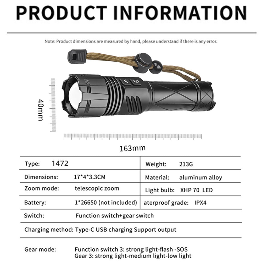 - --Premium Aluminum Alloy Material: Led flashlights are made of high-strength aluminum alloy material, which is durable and can withstand a high drop.