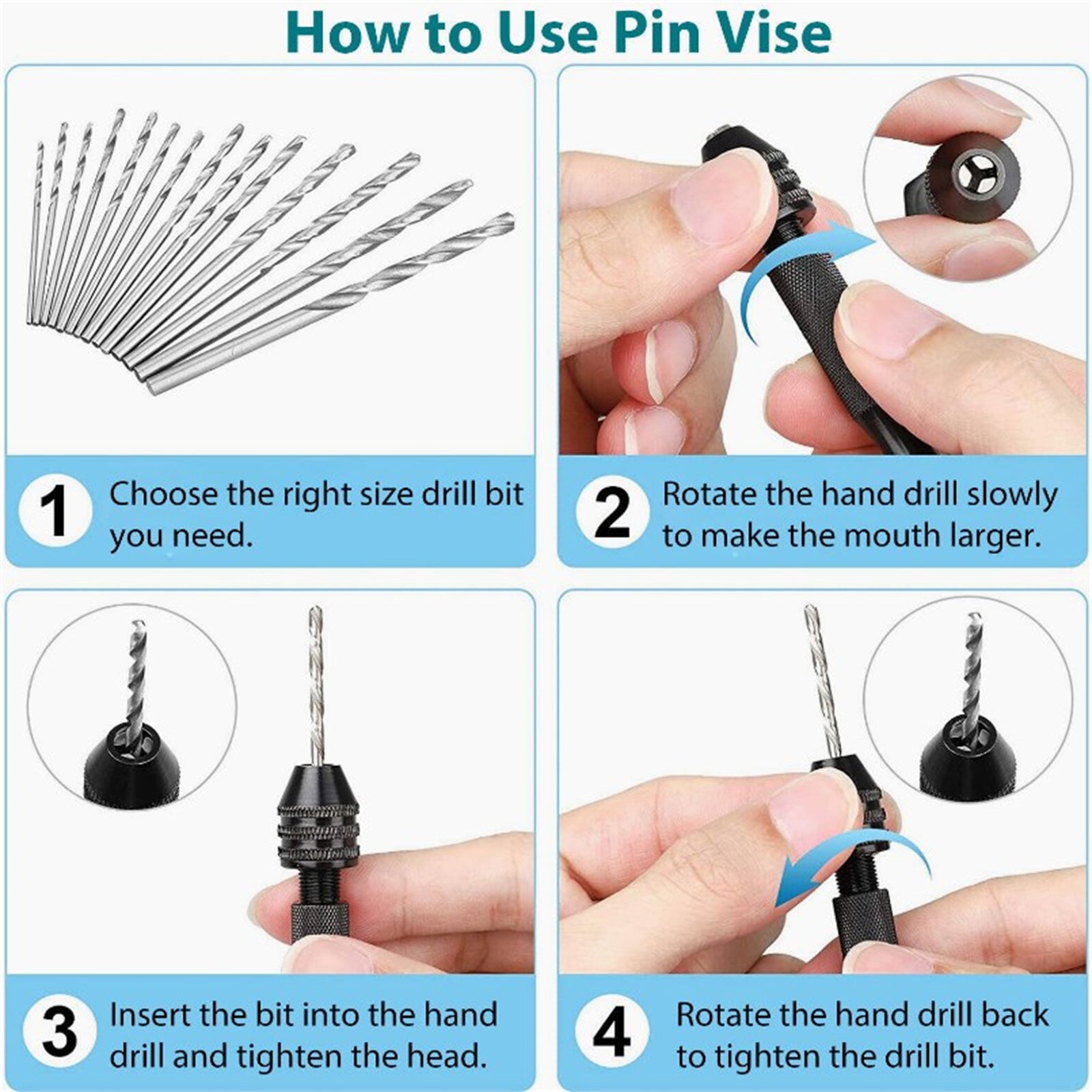 - --Material: Pin vise are made of aluminum alloy, durable and sturdy, and can accommodate small drill bits, wires, reamers, and manual drilling tools. They are suitable for electronic assembly, tool manufacturing, and model making.