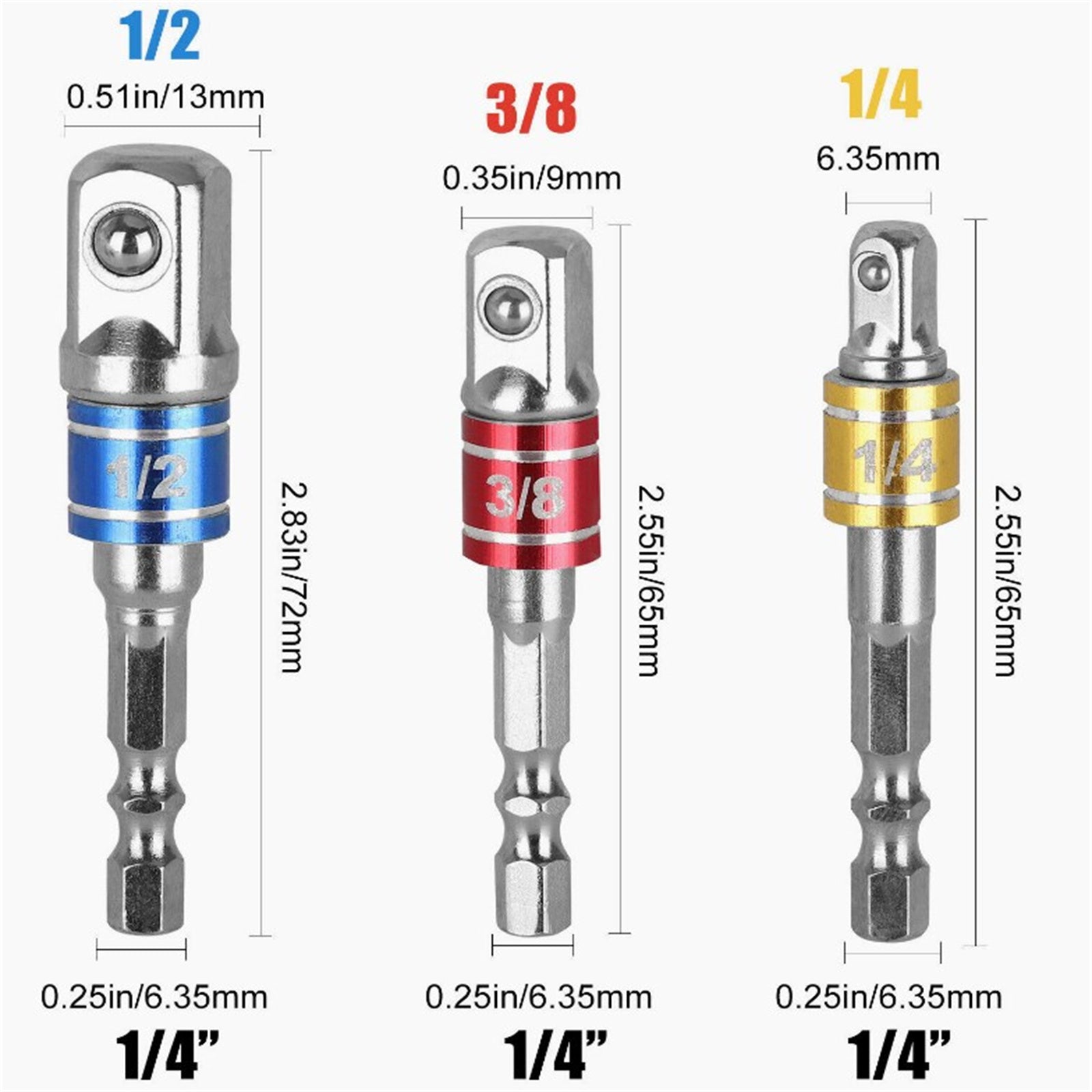 - --Color impact sleeves: 1/4 'drive adapter, 3/8' drive adapter, and 1/2 'drive adapter, each equipped with a 1/4 inch hex shank drive sleeve adapter kit.
